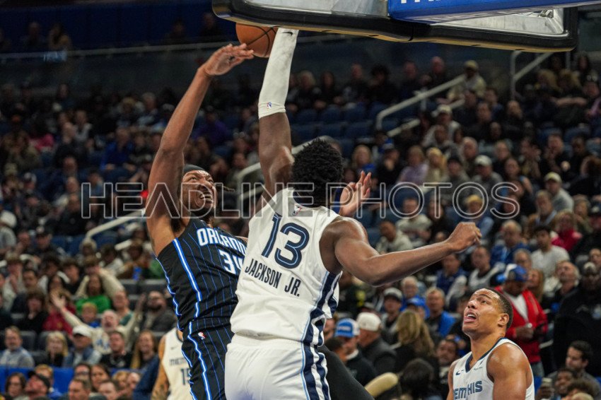 Orlando, Florida, USA, February 21, 2025, Orlando Magic forward Wendell Carter Jr #34 attempt to make a basket but is blocked by Jaren Jackson Jr #13 at the Kia Center. (Photo Credit: Marty Jean-Louis)