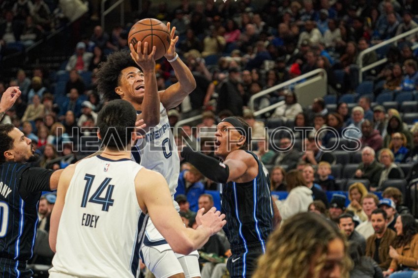 Orlando, Florida, USA, February 21, 2025, Memphis Grizzlies forward Jaylen Wells #0 attempt to score at the Kia Center. (Photo Credit: Marty Jean-Louis)