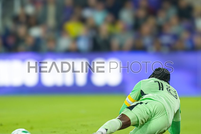 Orlando, Florida, USA, February 22, 2025, Philadelphia Union goalkeeper Andre Blake #18 makes a save at Exploria Stadium. (Photo Credit: Marty Jean-Louis)