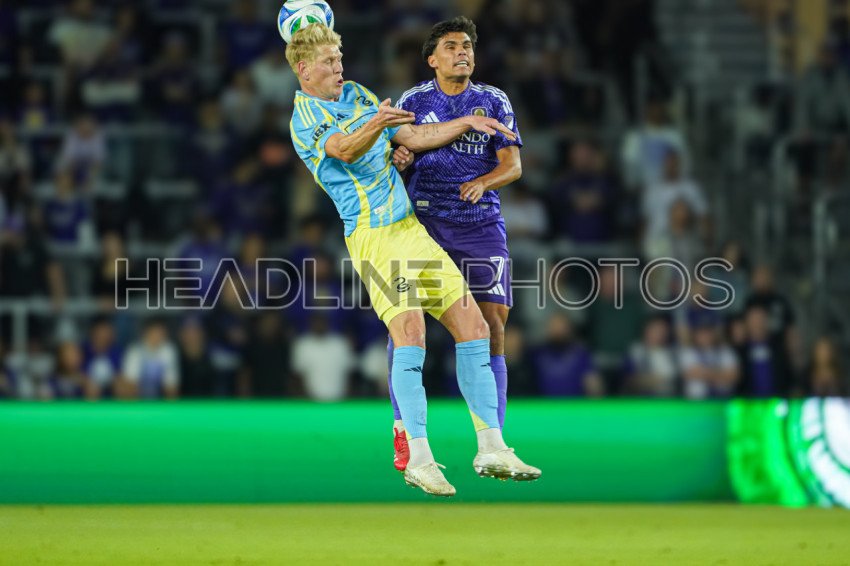 Orlando, Florida, USA, February 22, 2025, Philadelphia Union defender Jakob Glesnes #5 wins the header at Exploria Stadium. (Photo Credit: Marty Jean-Louis)