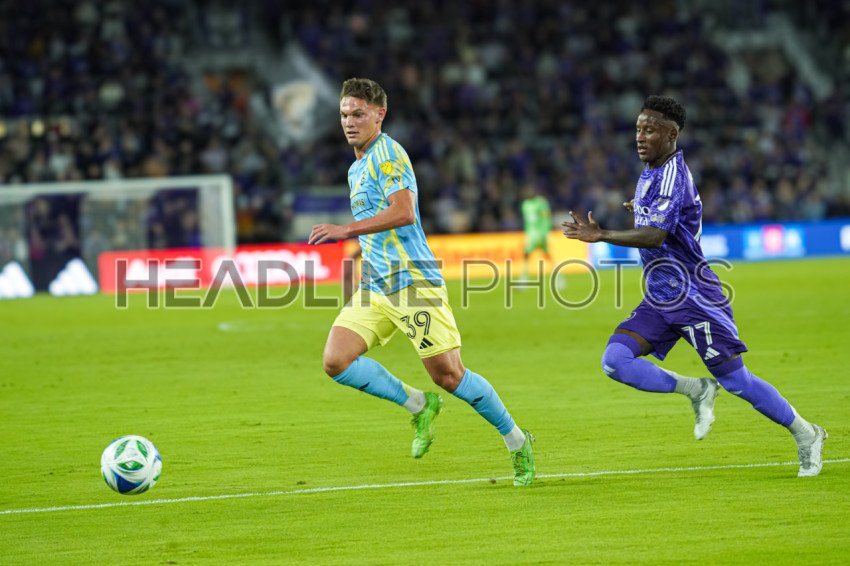 Orlando, Florida, USA, February 22, 2025, Philadelphia Union defender Francis Westfield #39 and Orlando City SC forward Ivan Angulo #77 runs after the ball during the first half at Exploria Stadium. (Photo Credit: Marty Jean-Louis)