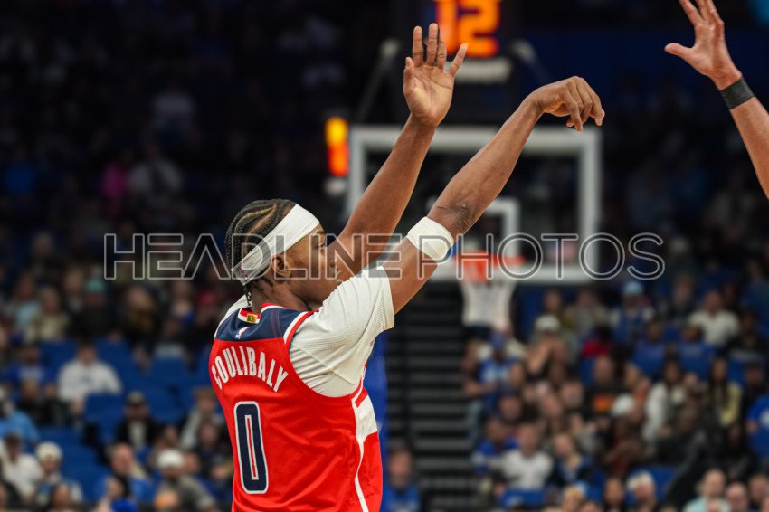 Orlando, Florida, USA, February 23, 2025, Washington Wizards forward Bilal Coulibaly #0 shoots a three at the Kia Center. (Photo Credit: Marty Jean-Louis)