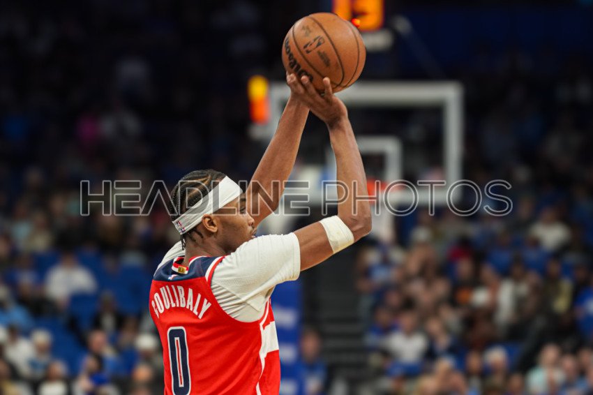 Orlando, Florida, USA, February 23, 2025, Washington Wizards forward Bilal Coulibaly #0 shoots a three at the Kia Center. (Photo Credit: Marty Jean-Louis)