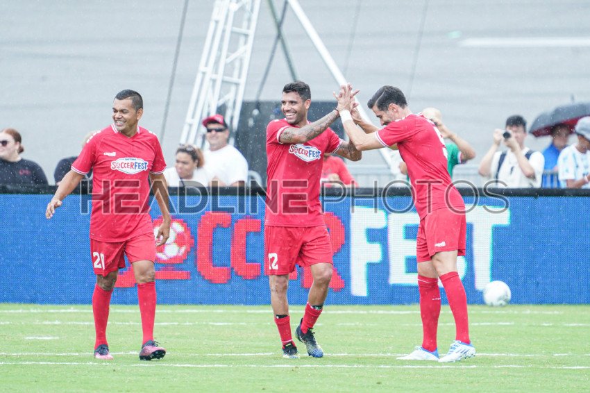 Daytona, Florida, USA, July 2, 2022, Team Americas players celebrate goal during the Legends Game at the SoccerFest at Daytona Speedway. (Photo Credit: Marty Jean-Louis)