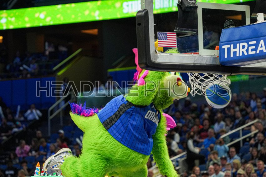 Orlando, Florida, USA, February 23, 2025, The Orlando Magic Mascot Stuff the Magic Dragon doing some acrobatics at the Kia Center. (Photo Credit: Marty Jean-Louis)