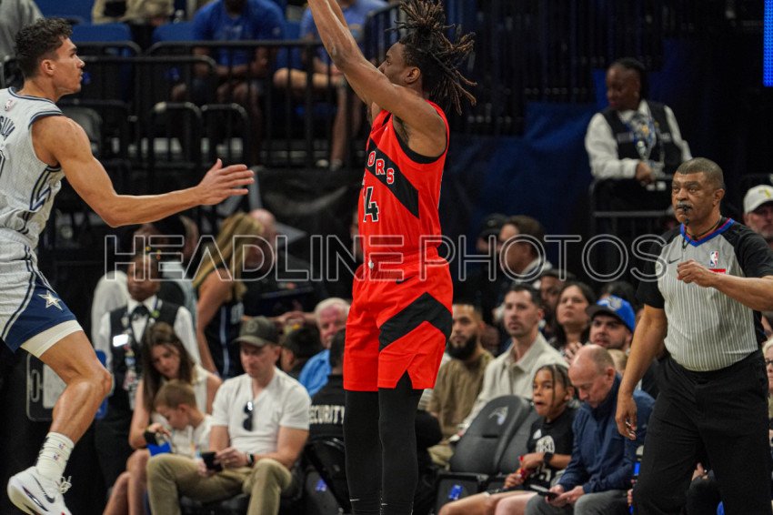Orlando, Florida, USA, March 2, 2025, Toronto Raptors guard Ja'Kobe Walter #14 shoots a three at the Kia Center. (Photo Credit: Marty Jean-Louis)