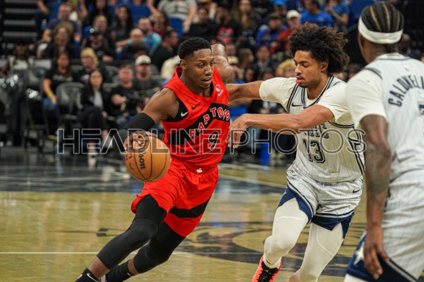 Orlando, Florida, USA, March 2, 2025, Toronto Raptors forward RJ Barrett #9 rushes pass Jett Howard #13 at the Kia Center. (Photo Credit: Marty Jean-Louis)