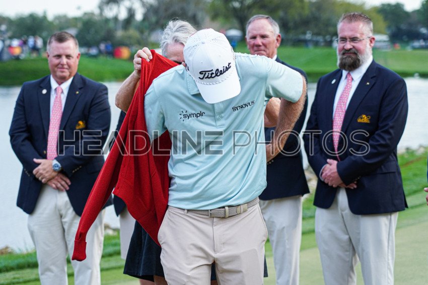 Orlando, Florida, USA, March 9, 2024, Russell Henley wearing the red jacket after winning the 2025 Arnold Palmer Invitational at Bay Hill Club. (Photo Credit: Marty Jean-Louis)