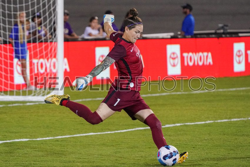Orlando, Florida, USA, April 16, 2022, Orlando Pride Goalkeeper Erin McLeod #1 makes a kick i the first half at the Daytona International Speedway. (Photo Credit: Marty Jean-Louis)