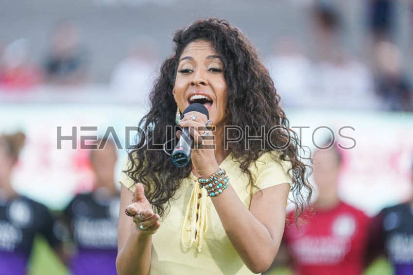 Orlando, Florida, USA, April 16, 2022, Singer Adassa performs the National Anthem before the Racing Louisville FC vs Orlando Pride game at the Daytona International Speedway. (Photo Credit: Marty Jean-Louis)