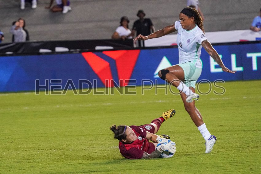 Orlando, Florida, USA, April 16, 2022, Orlando Pride Goalkeeper Erin McLeod #1 attempt to make a save at the Daytona International Speedway. (Photo Credit: Marty Jean-Louis)