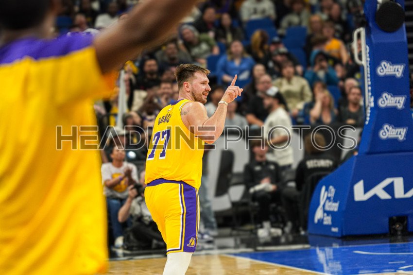 Orlando, Florida, USA, March 24, 2025, Los Angeles Lakers guard Luka Doncic #77 reacts after scoring a three up at the Kia Center. (Photo Credit: Marty Jean-Louis)