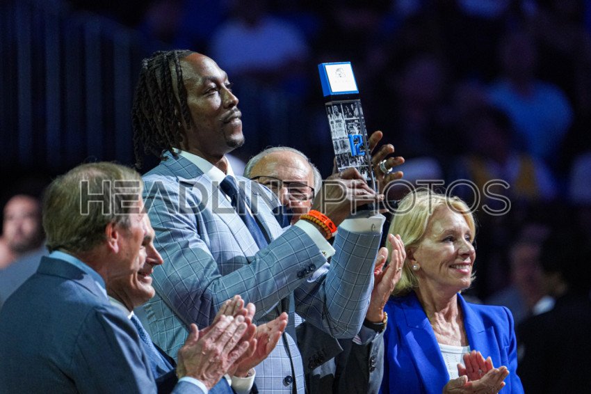Orlando, Florida, USA, March 24, 2025, Former Orlando Magic player Dwight Howard receives an award at the Kia Center. (Photo Credit: Marty Jean-Louis)