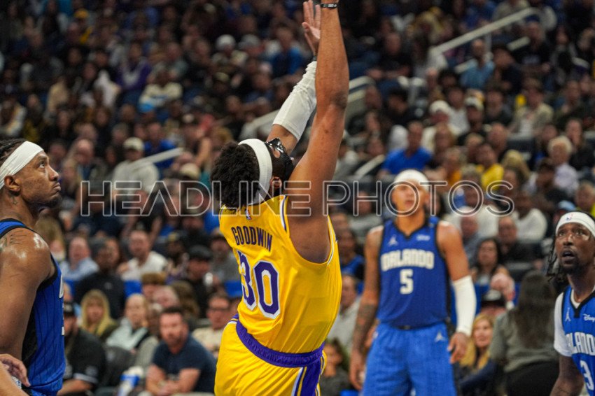 Orlando, Florida, USA, March 24, 2025, Los Angeles Lakers forward Jordan Goodwin #30 attempt to score at the Kia Center. (Photo Credit: Marty Jean-Louis)