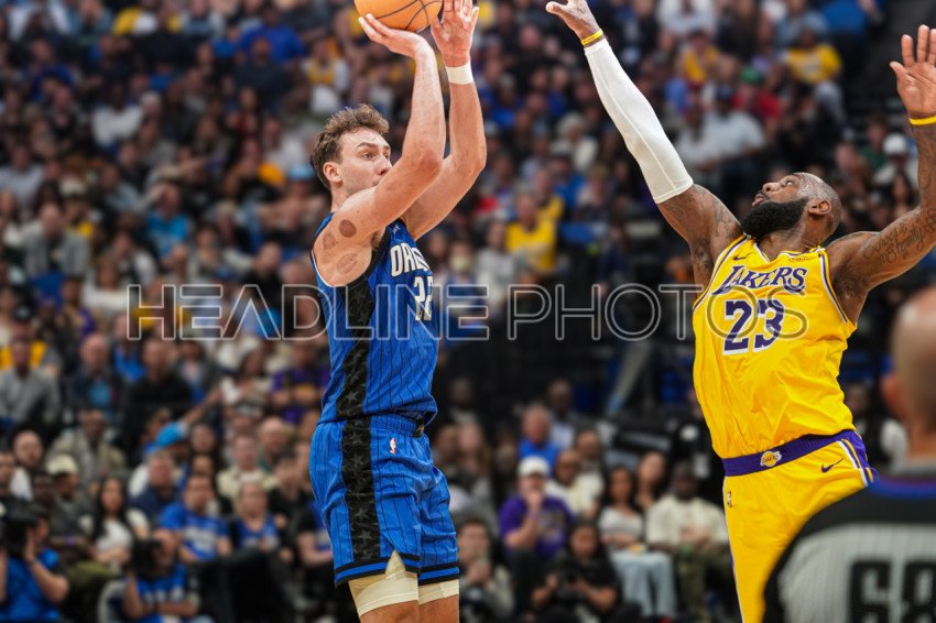 Orlando, Florida, USA, March 24, 2025, Orlando Magic forward Franz Wagner #22 shoots a three as Lebron James #23 tries to block at the Kia Center. (Photo Credit: Marty Jean-Louis)