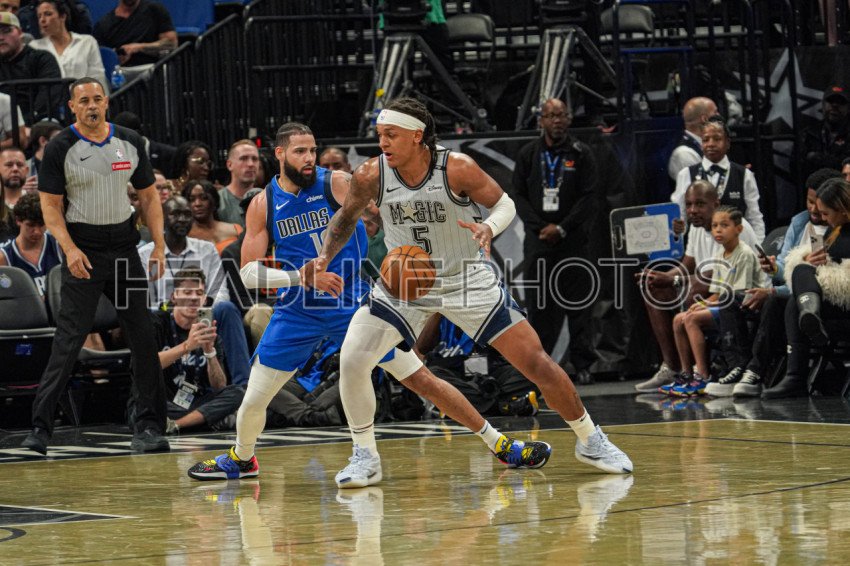 Orlando, Florida, USA, March 27, 2025, Orlando Magic forward Paolo Banchero #5 controls the ball as Caleb Martin 16 at the Kia Center. (Photo Credit: Marty Jean-Louis)