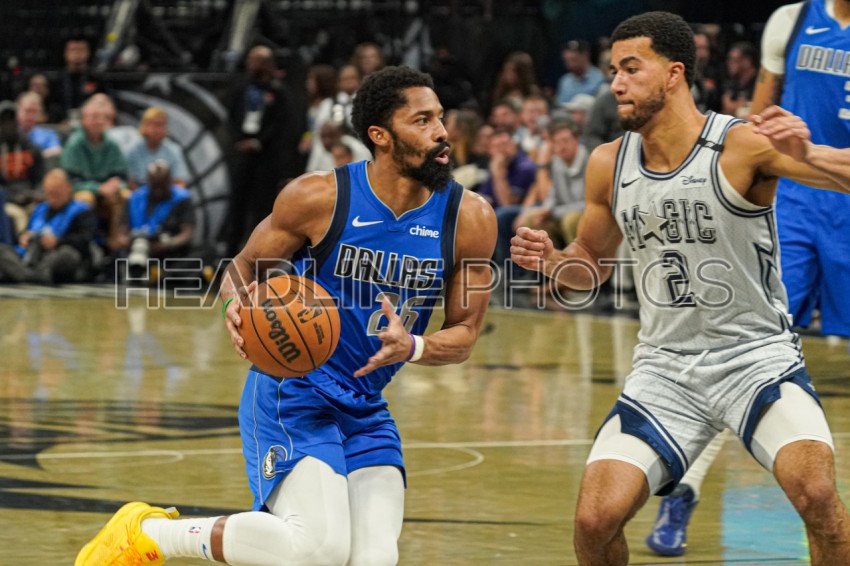Orlando, Florida, USA, March 27, 2025, Dallas Mavericks guard Spencer Dinwiddie #26 rushes pass Caleb Houstan #2 at the Kia Center. (Photo Credit: Marty Jean-Louis)