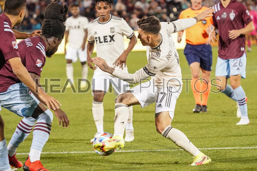 Denver, Colorado, USA, November 7, 2021, Los Angeles FC forward Brian Rodriguez #17 attempt to run pass Colorado Rapids players at Dick’s Sporting Goods Park (Photo Credit: Marty Jean-Louis)