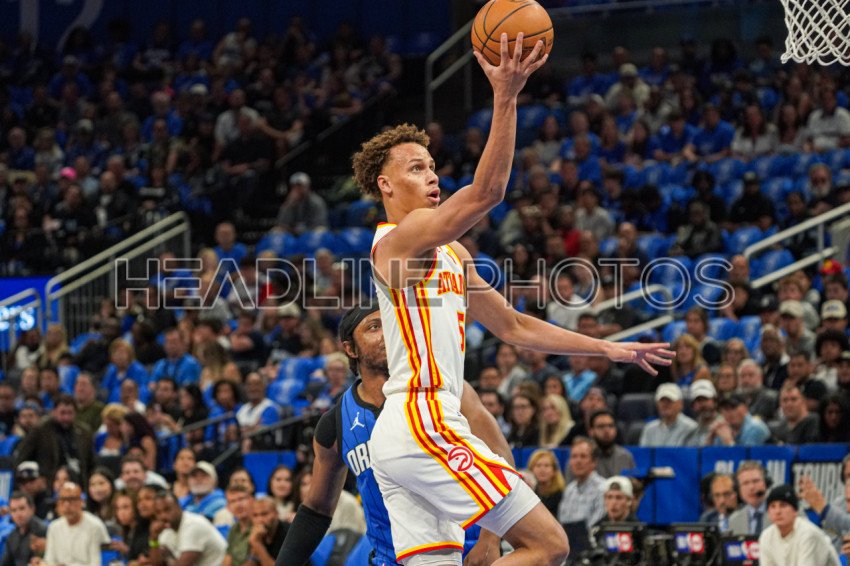 Orlando, Florida, USA, April 15, 2025, Atlanta Hawks guard Dyson Daniels #5 jump to make a basket at the Kia Center. (Photo Credit: Marty Jean-Louis)