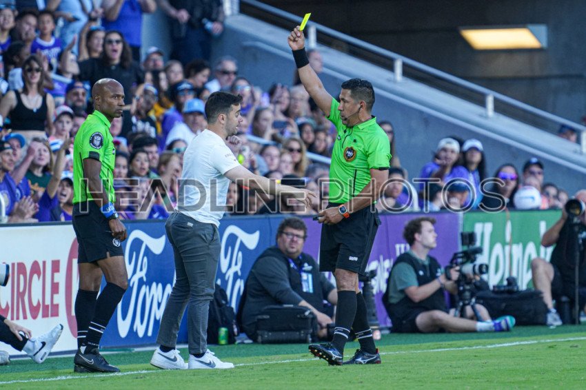 Orlando, Florida, USA, April 19, 2025, Washington Spirit head coach Jonatan Giraldez Costas receives a yellow card from Referee Elton Garcia at Inter&Co Stadium. (Photo Credit: Marty Jean-Louis)