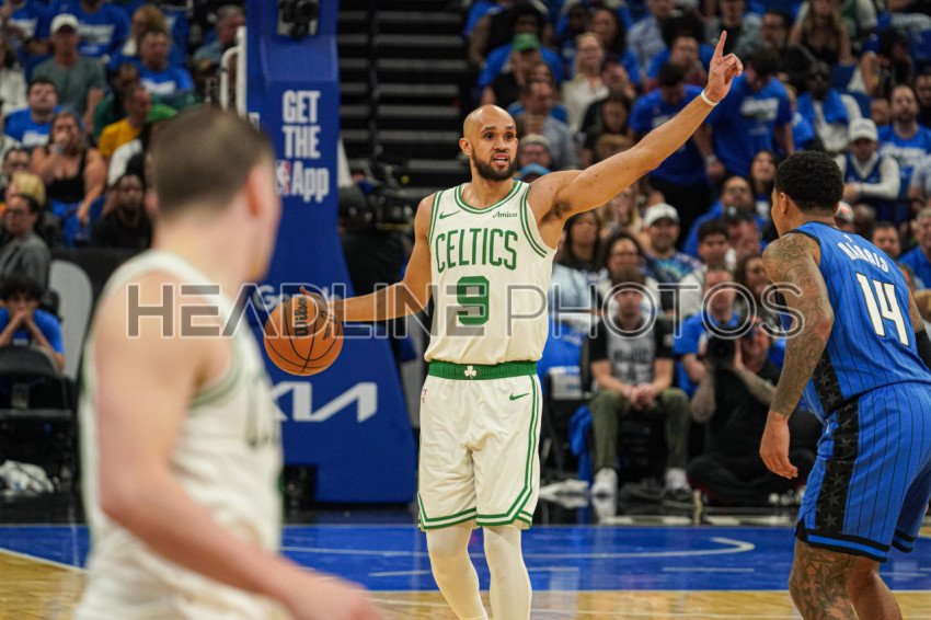 Orlando, Florida, USA, April 25, 2025, Boston Celtics guard Derrick White #9 moves forward at the Kia Center. (Photo Credit: Marty Jean-Louis)
