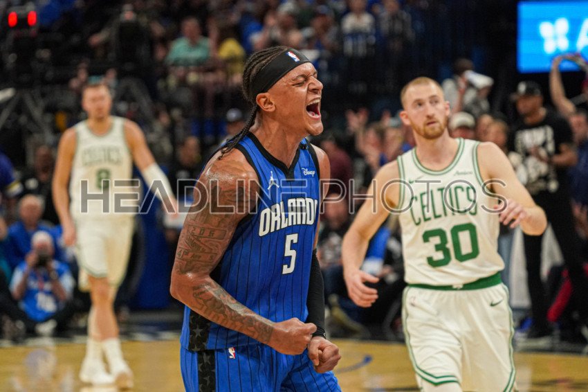 Orlando, Florida, USA, April 25, 2025, Orlando Magic forward Paolo Banchero #5 reacts after making a three at the Kia Center. (Photo Credit: Marty Jean-Louis)
