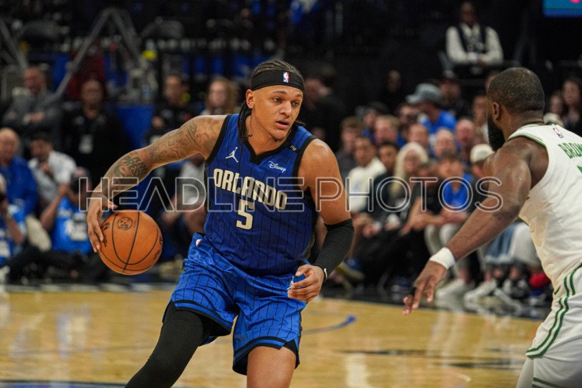 Orlando, Florida, USA, April 25, 2025, Orlando Magic forward Paolo Banchero #5 rushes forward at the Kia Center. (Photo Credit: Marty Jean-Louis)