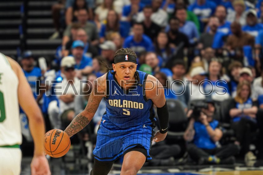Orlando, Florida, USA, April 27, 2025, Orlando Magic forward Paolo Banchero #5 rushes forward at the Kia Center. (Photo Credit: Marty Jean-Louis)