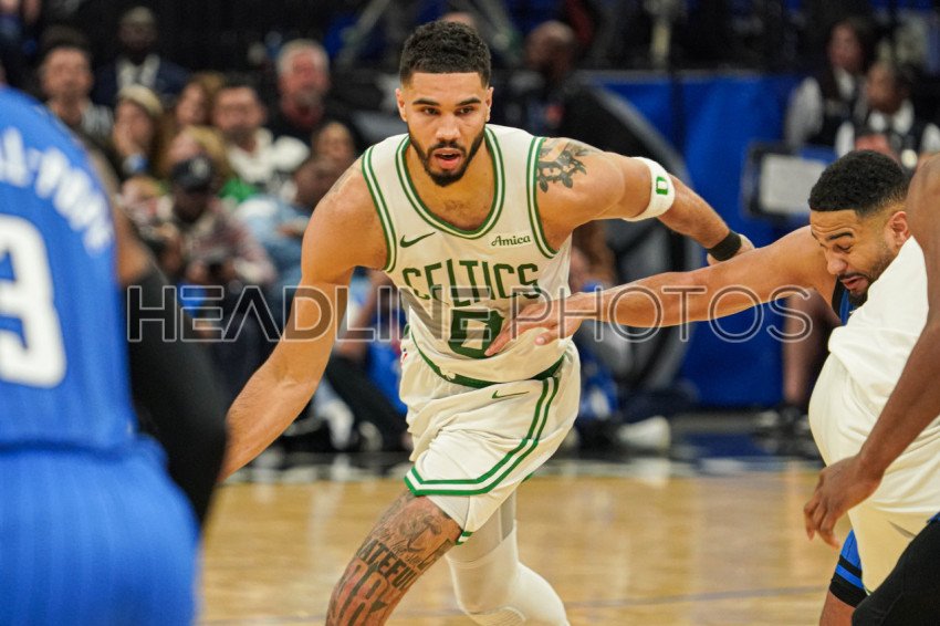 Orlando, Florida, USA, April 27, 2025, Boston Celtics forward Jayson Tatum #0 rushes past Cory Joseph #10 at the Kia Center. (Photo Credit: Marty Jean-Louis)