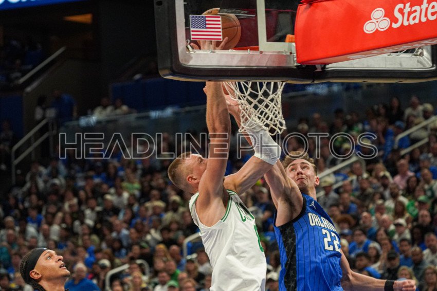 Orlando, Florida, USA, April 27, 2025, Boston Celtics center Kristaps Porzingis #8 attempt to score but is fouled by Franz Wagner #22 at the Kia Center. (Photo Credit: Marty Jean-Louis)