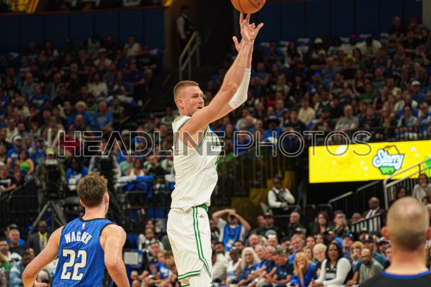 Orlando, Florida, USA, April 27, 2025, Boston Celtics center Kristaps Porzingis #8 shoots a three at the Kia Center. (Photo Credit: Marty Jean-Louis)