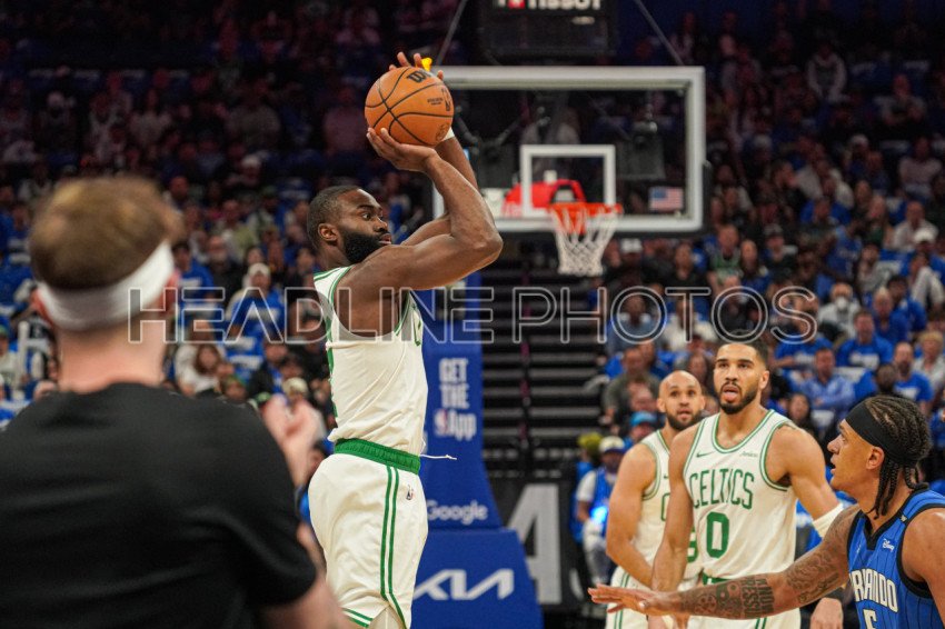 Orlando, Florida, USA, April 27, 2025, Boston Celtics guard Jaylen Brown #7 shoots a three at the Kia Center. (Photo Credit: Marty Jean-Louis)