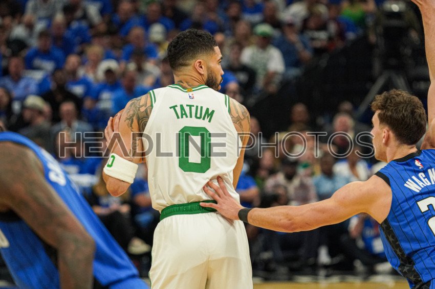 Orlando, Florida, USA, April 27, 2025, Boston Celtics forward Jayson Tatum #0 defending the ball during the first half at the Kia Center. (Photo Credit: Marty Jean-Louis)