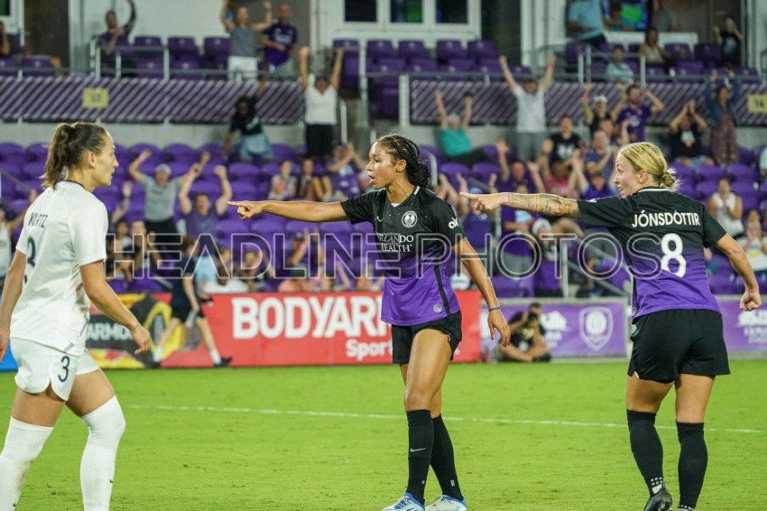 Orlando, Florida, USA, April 16, 2022, Orlando Pride players Darian Jenkins #11 and Gunnhildur Jonsdottir #8 reacts after a goal in the second half at Exploria Stadium. (Photo Credit: Marty Jean-Louis)