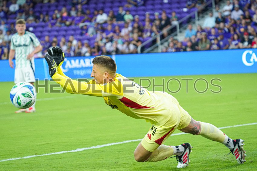 Orlando, Florida, USA, May 10, 2025, New England goalkeeper Aljaž Ivačič #31 makes a save at Inter&Co Stadium. (Photo Credit: Marty Jean-Louis)