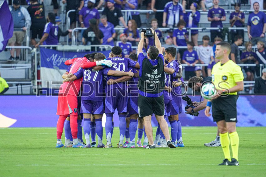 Orlando, Florida, USA, May 10, 2025, Orlando City SC players huddle before the match at Inter&Co Stadium. (Photo Credit: Marty Jean-Louis)