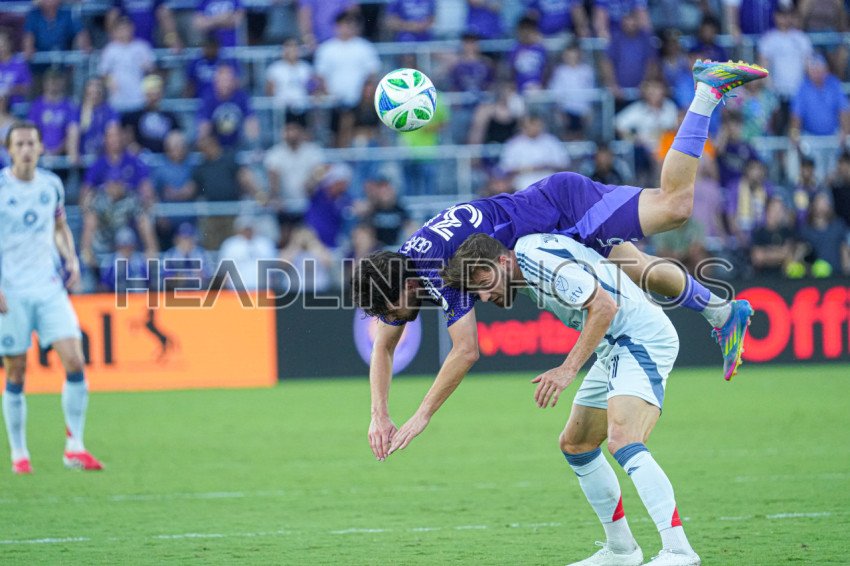 Orlando, Florida, USA, May 31, 2025, Orlando City SC player Joran Gerbet #35 jumps to make a header but lands on the back of Philip Zinckernagel #11 at Inter&Co Stadium. (Photo Credit: Marty Jean-Louis)