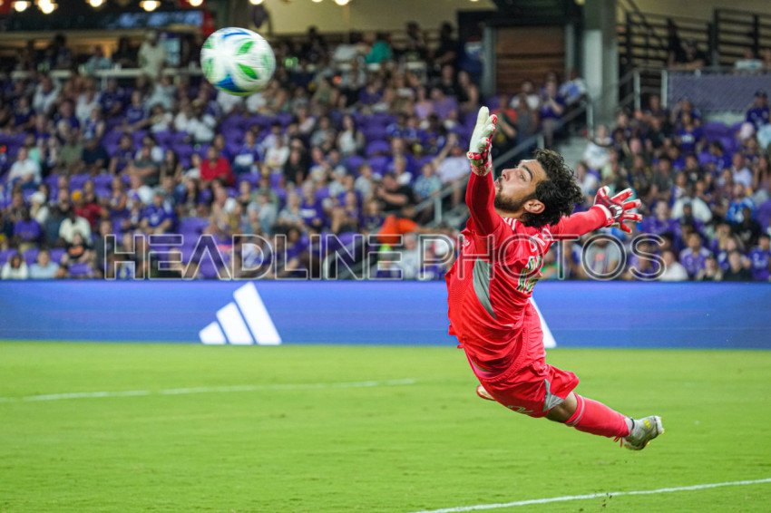 Orlando, Florida, USA, July 16, 2025, Orlando City SC goalkeeper Javier Otero #12 jump and stretches to go after a ball at Inter&Co Stadium. (Photo Credit: Marty Jean-Louis)