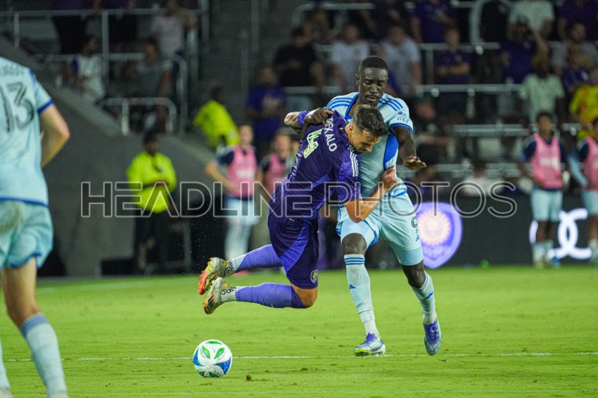 Orlando, Florida, USA, July 16, 2025, Orlando City SC player David Brekalo #4 is fouled by Prince Owusu #9 at Inter&Co Stadium. (Photo Credit: Marty Jean-Louis)
