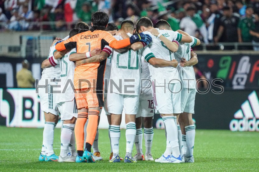 Orlando, Florida, USA, April 27, 2022, Mexican players huddle before the opening whistle at Camping World Stadium. (Photo Credit: Marty Jean-Louis)
