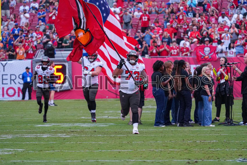 Tampa Bay, Florida, USA, August 23, 2025, Tampa Bay Buccaneers player Dvon J-Thomas running with the Bucs Flag at Raymond James Stadium. (Photo Credit: Marty Jean-Louis)