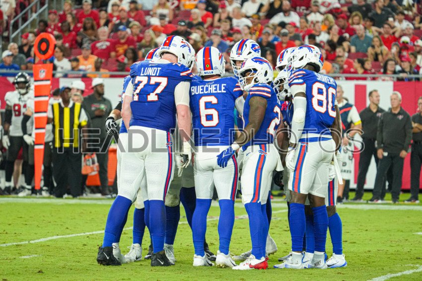 Tampa Bay, Florida, USA, August 23, 2025, Buffalo Bills players huddle at Raymond James Stadium. (Photo Credit: Marty Jean-Louis)