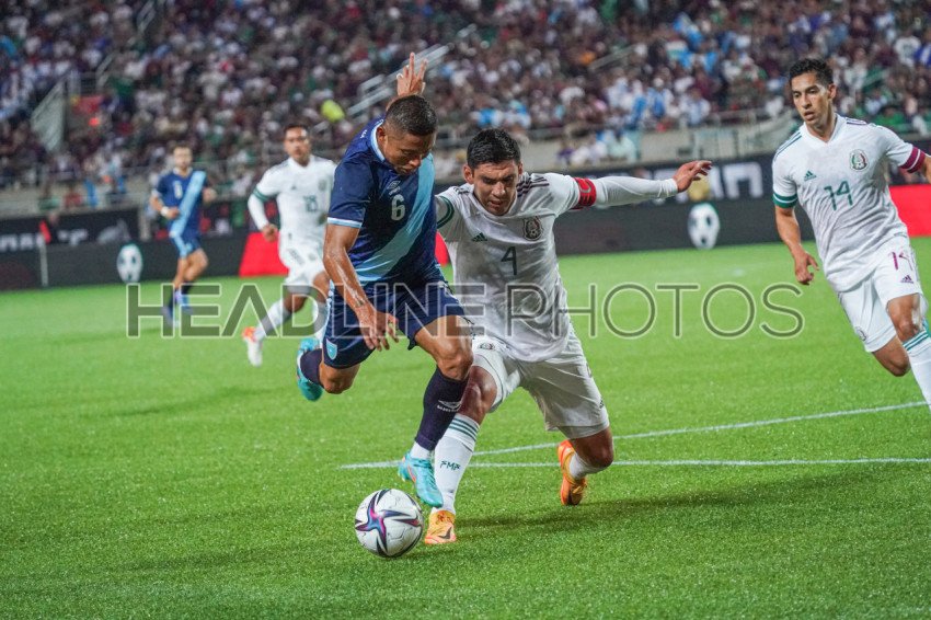 Orlando, Florida, USA, April 27, 2022, Guatemala player Carlos Mejía #6 and Mexico player Jesús Angulo #4 fight for the ball in the first half at Camping World Stadium. (Photo Credit: Marty Jean-Louis)