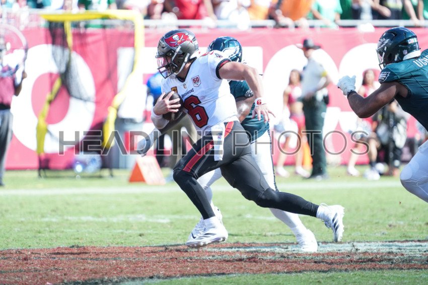 Tampa Bay, Florida, USA, September 28, 2025, Tampa Bay Buccaneers quarterback Baker Mayfield #6 on the run at Raymond James Stadium. (Photo Credit: Marty Jean-Louis)