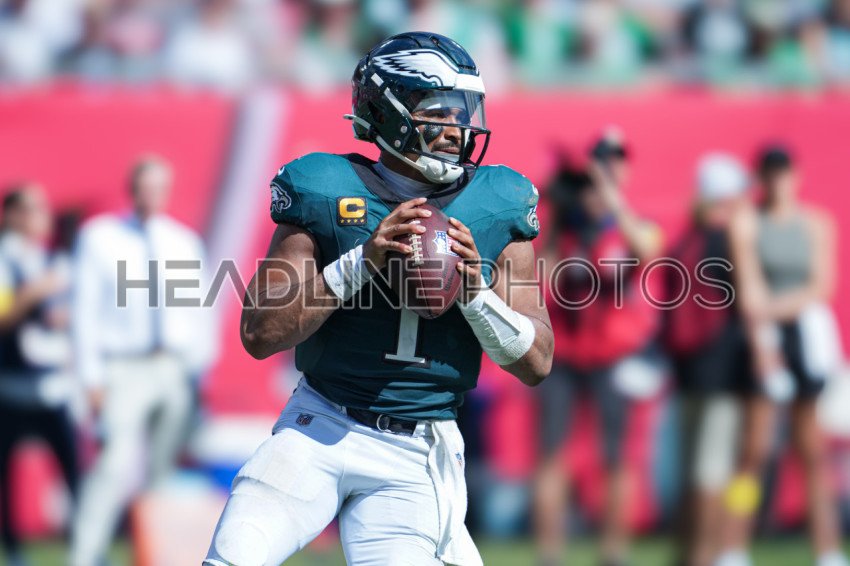 Tampa Bay, Florida, USA, September 28, 2025, Philadelphia Eagles quarterback Jalen Hurts #1 makes a pass at Raymond James Stadium. (Photo Credit: Marty Jean-Louis)