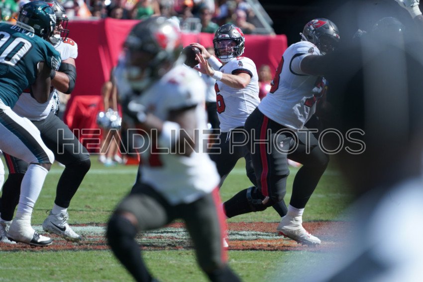 Tampa Bay, Florida, USA, September 28, 2025, Tampa Bay Buccaneers quarterback Baker Mayfield #6 looks to make a pass at Raymond James Stadium. (Photo Credit: Marty Jean-Louis)