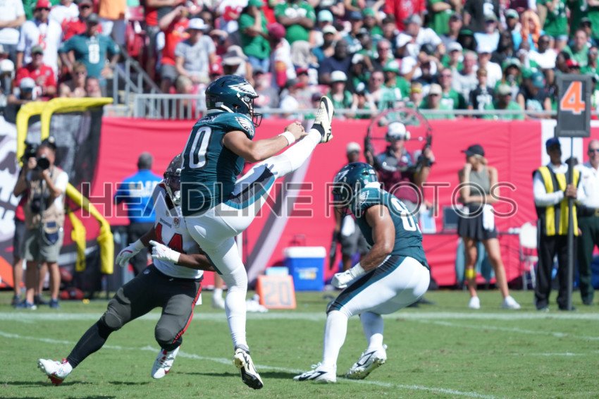 Tampa Bay, Florida, USA, September 28, 2025, Philadelphia Eagles punter Braden Mann #10 makes a punt at Raymond James Stadium. (Photo Credit: Marty Jean-Louis)