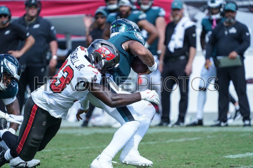 Tampa Bay, Florida, USA, September 28, 2025, Philadelphia Eagles quarterback Jalen Hurts #1 gets tackled at Raymond James Stadium. (Photo Credit: Marty Jean-Louis)