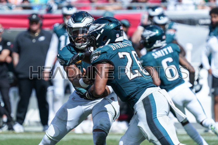 Tampa Bay, Florida, USA, September 28, 2025, Philadelphia Eagles quarterback Jalen Hurts #1 makes a pass to Saquon Barkley #26 at Raymond James Stadium. (Photo Credit: Marty Jean-Louis)