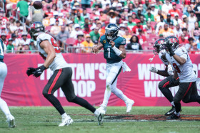 Tampa Bay, Florida, USA, September 28, 2025, Philadelphia Eagles quarterback Jalen Hurts #1 makes a pass at Raymond James Stadium. (Photo Credit: Marty Jean-Louis)